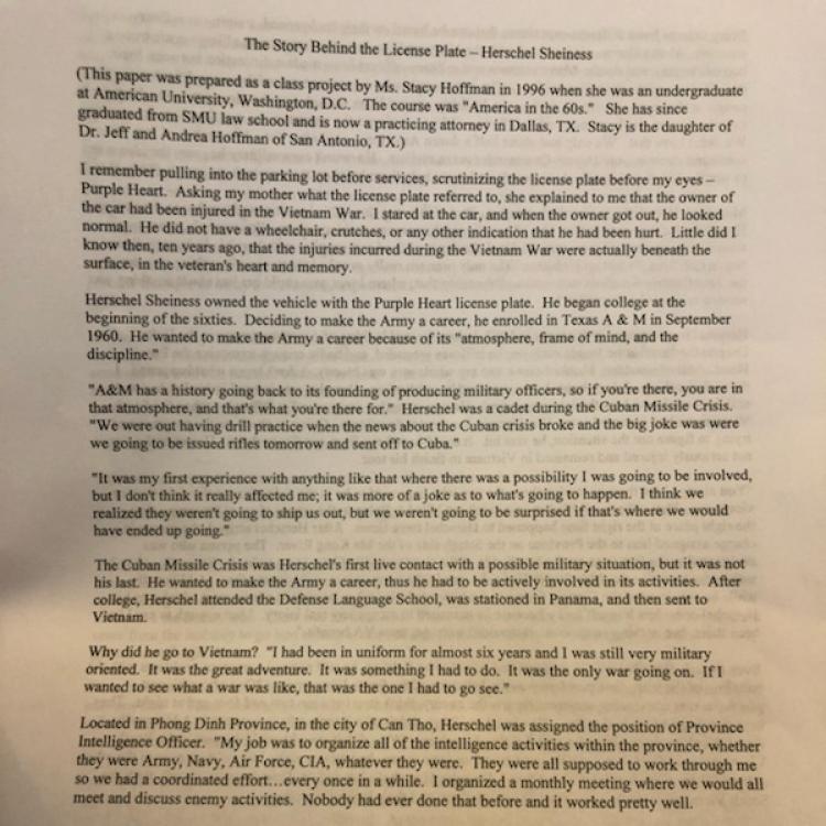 served in the U.S. Army from 1965 to 1968. He served a tour in Vietnam as an Intelligence Officer and was awarded a Purple Heart. Mr. Sheiness resides in San Antonio, Texas and is the current Commander of the Jewish War Veterans Post 753.