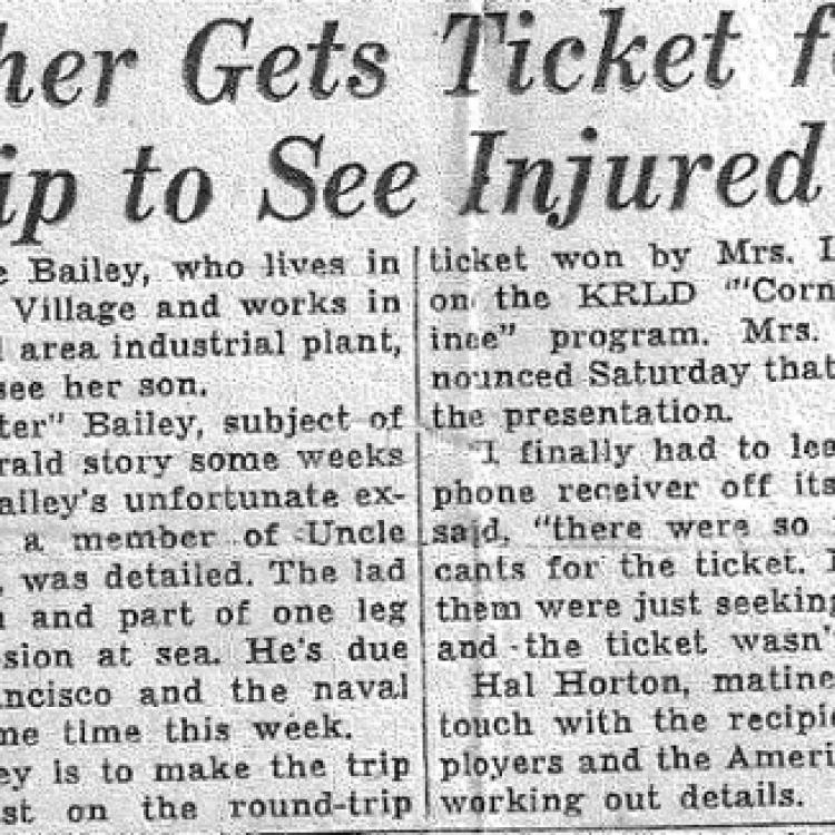 Buster Lee Bailey a native of Dallas, Texas enlisted in the U.S. Army Air Forces in 1946, and served as a Radio Operator. He survived a crash in a C-46 cargo plane on Palmyra Island, about 100 miles south of Hawaii on July 8, 1947. He now resides at the Frank M. Tejeda Texas State Veterans Home in Floresville, Texas.