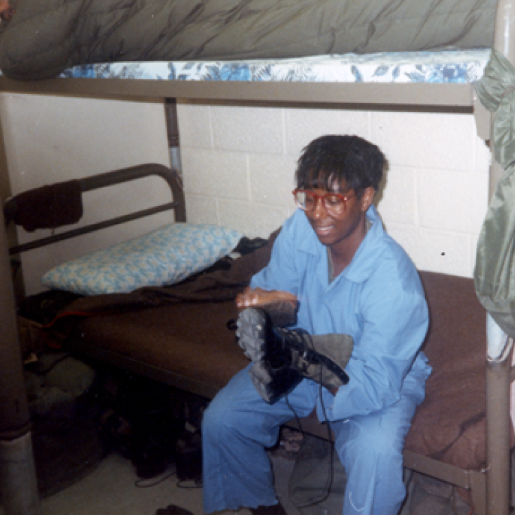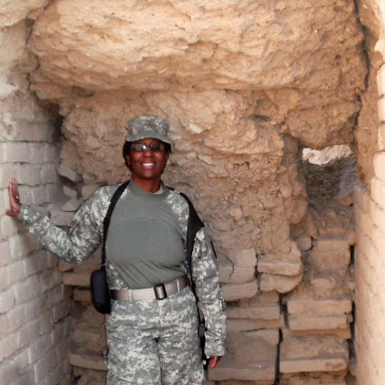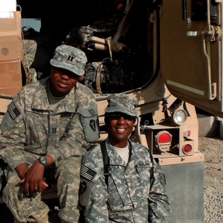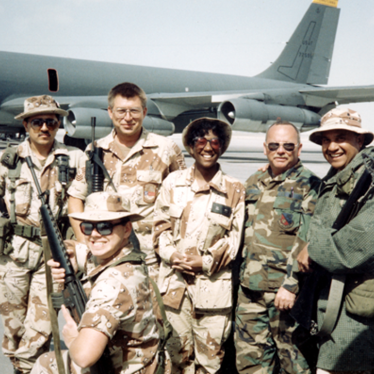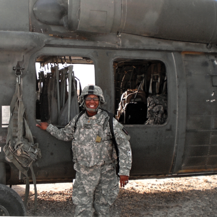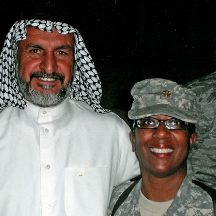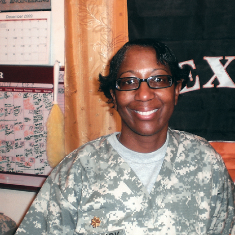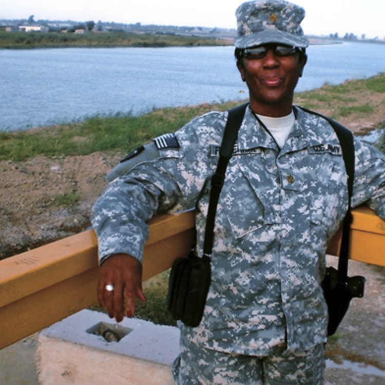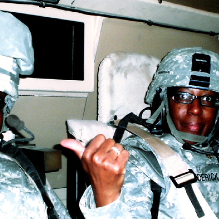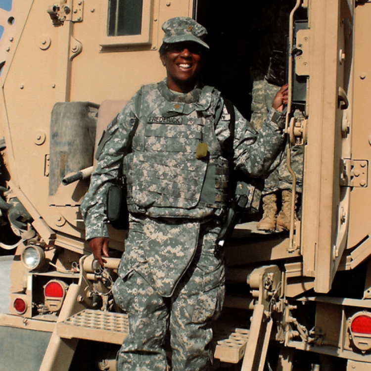 A native of Abilene, Texas, Sharon Frederick served in the USAF as an MP guarding an airbase in Dubai during Operations Desert Shield and Desert Storm. She later joined the Army's Medical Corps and is now a major in the reserves.