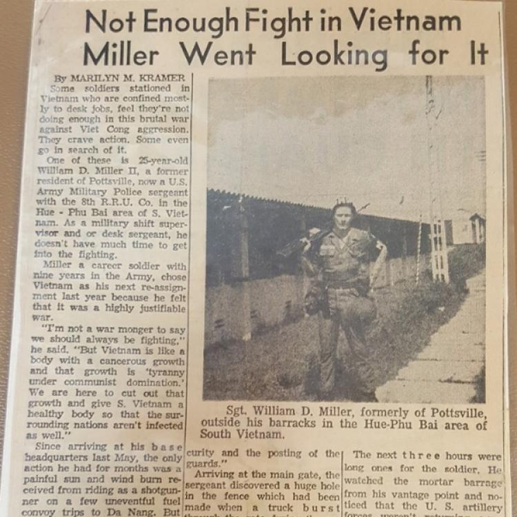 William Miller joined the U.S. Army in 1958 at the age of seventeen. He served in Italy, Germany, Texas, and Vietnam. Mr. Miller served with the 8th R.R.U. Co. as a Military Police Officer in the Hue Pue Bai area of South Vietnam. When he returned to Fort Hood, he became a recruiter and left the service in 1974. Mr. Miller now resides at the William R. Courtney Texas State Veterans Home in Temple, Texas.