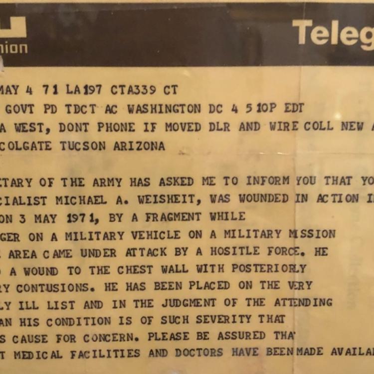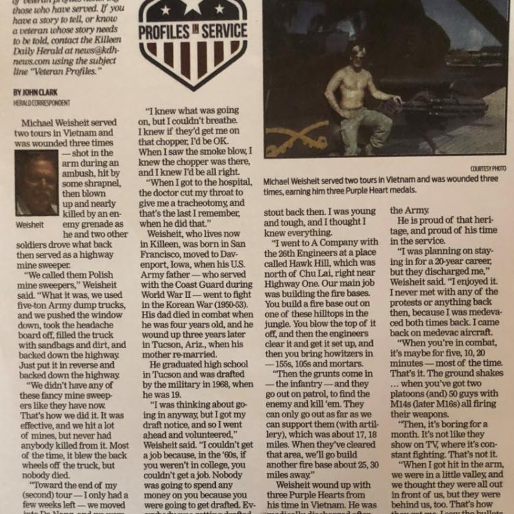 Michael Weisheit joined the U.S. Army in 1968 at the age of 19. In 1969 after training, he went to Vietnam as a combat engineer, clearing minefields and building firebases in Vietnam. Mr. Weisheit was awarded three purple hearts for injuries he received during combat and the bronze star for his courageous actions in Vietnam. He is now retired and lives in Killeen, Texas.