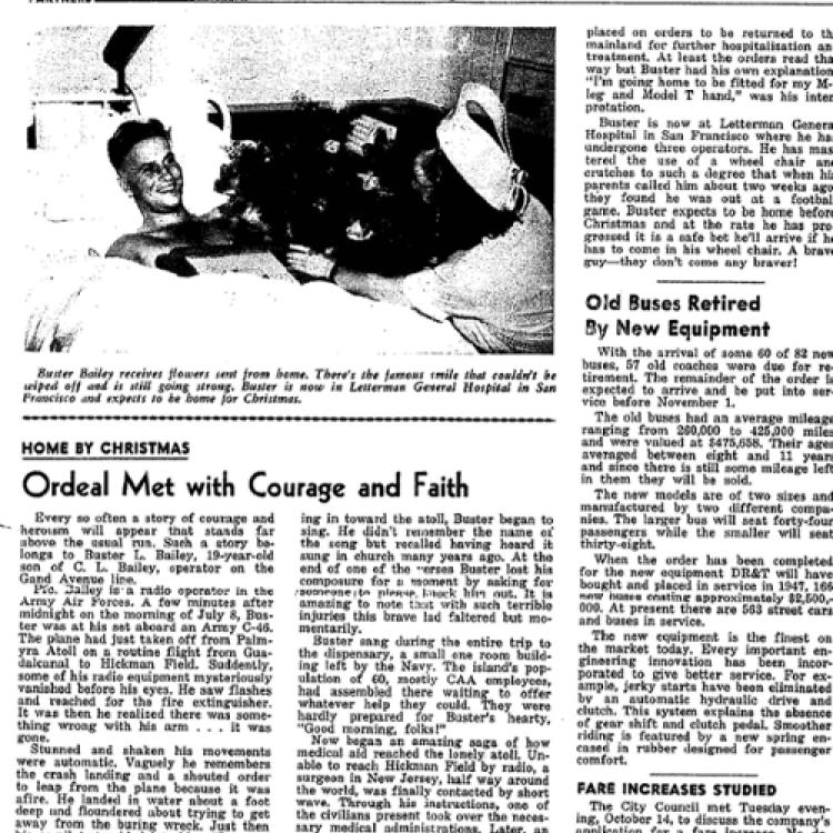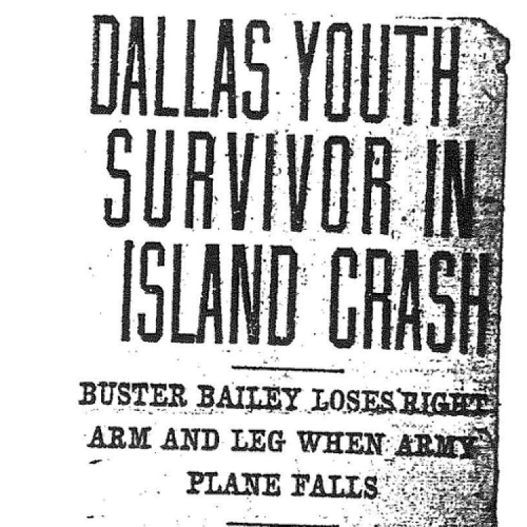 Buster Lee Bailey a native of Dallas, Texas enlisted in the U.S. Army Air Forces in 1946, and served as a Radio Operator. He survived a crash in a C-46 cargo plane on Palmyra Island, about 100 miles south of Hawaii on July 8, 1947. He now resides at the Frank M. Tejeda Texas State Veterans Home in Floresville, Texas.